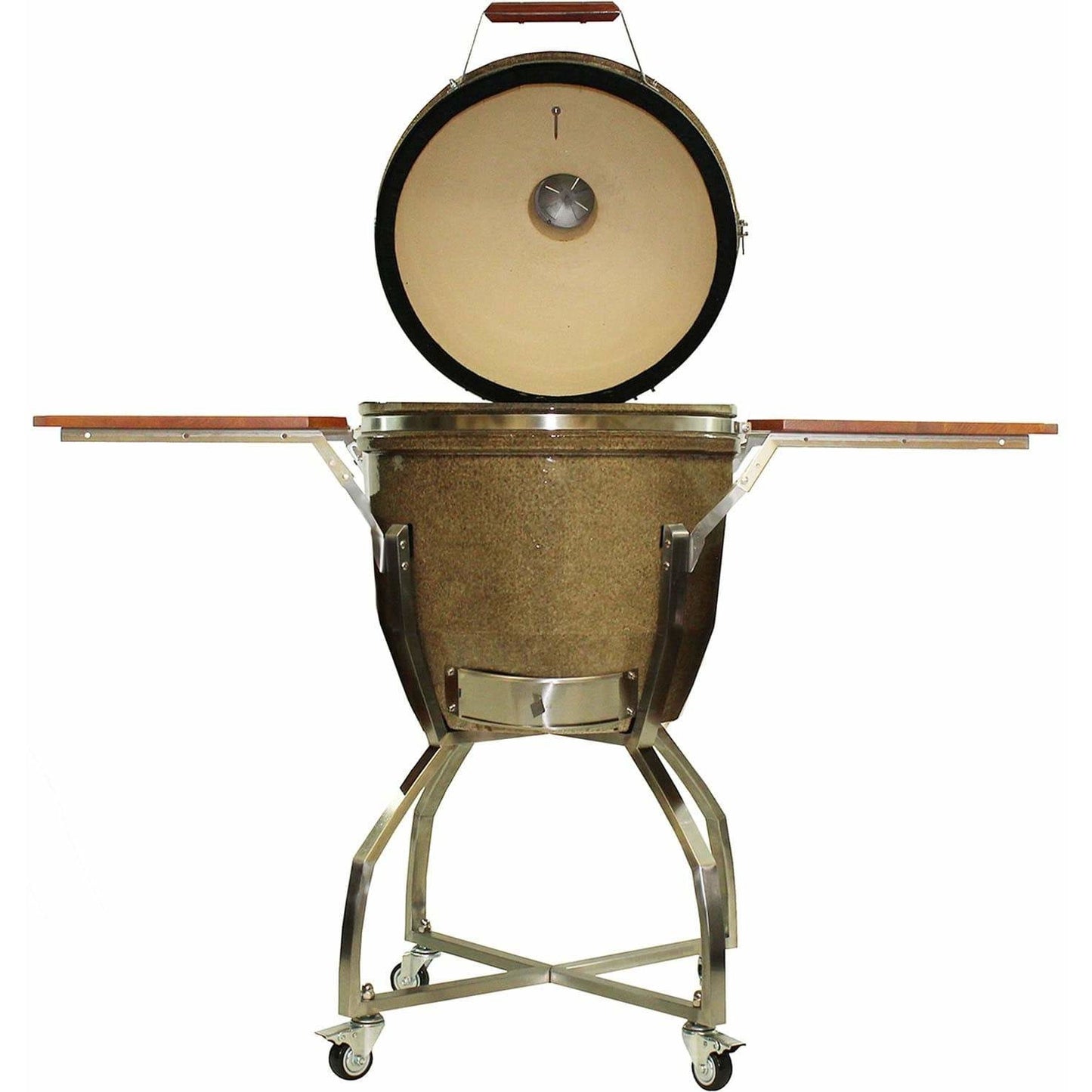- Bundle includes a 19 in. Kamado grill, stainless steel cart, red oak side shelves, and a grill cover