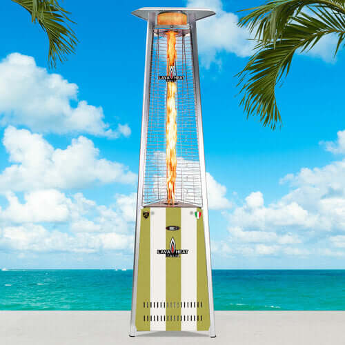 The 2G A-LINE-8RPS is our 8 ft. Commercial Flame Propane Heater in Stainless Steel. The new A-LINE series features upgraded hardware, finishes, and new eco-friendly heating options. Double-baked powder coating over stainless steel, as well as 304-grade hardware, make the A-LINE series a workhorse. With our industry-first 5-stage eco-burner and upgraded IR remote system, the A-LINE is the most technologically advanced heater on the market. A Borosilicate Glass tube encases our 4-foot adjustable “Column of Flame” that produces 66,000 BTUs of heat for up to 14 hours with a Propane Tank. The sleek 360-degree design provides superior heat distribution in a 36 square foot area. Touch-to-Start Technology accompanied with our Tilt Switch-Auto-Shutoff makes it safe, simple, and fast. The patented easy-snap magnetic door makes it easy to access the units’ burner assembly. Available in supreme finishes and various accessory options makes this A-Line a need for your outdoor space.