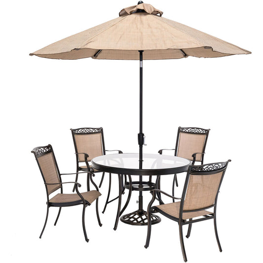 Hanover fontana 5 piece 4 sling dining chairs 51 inch round tile top table umbrella FNTDN5PCTN-SU