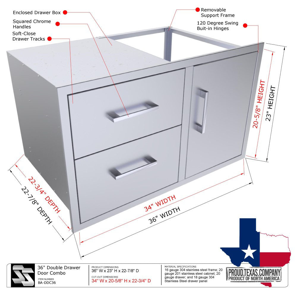Sunstone 36" Beveled Style Double Drawer & Door Combo w/Removable Support Frame - A-DDC36
