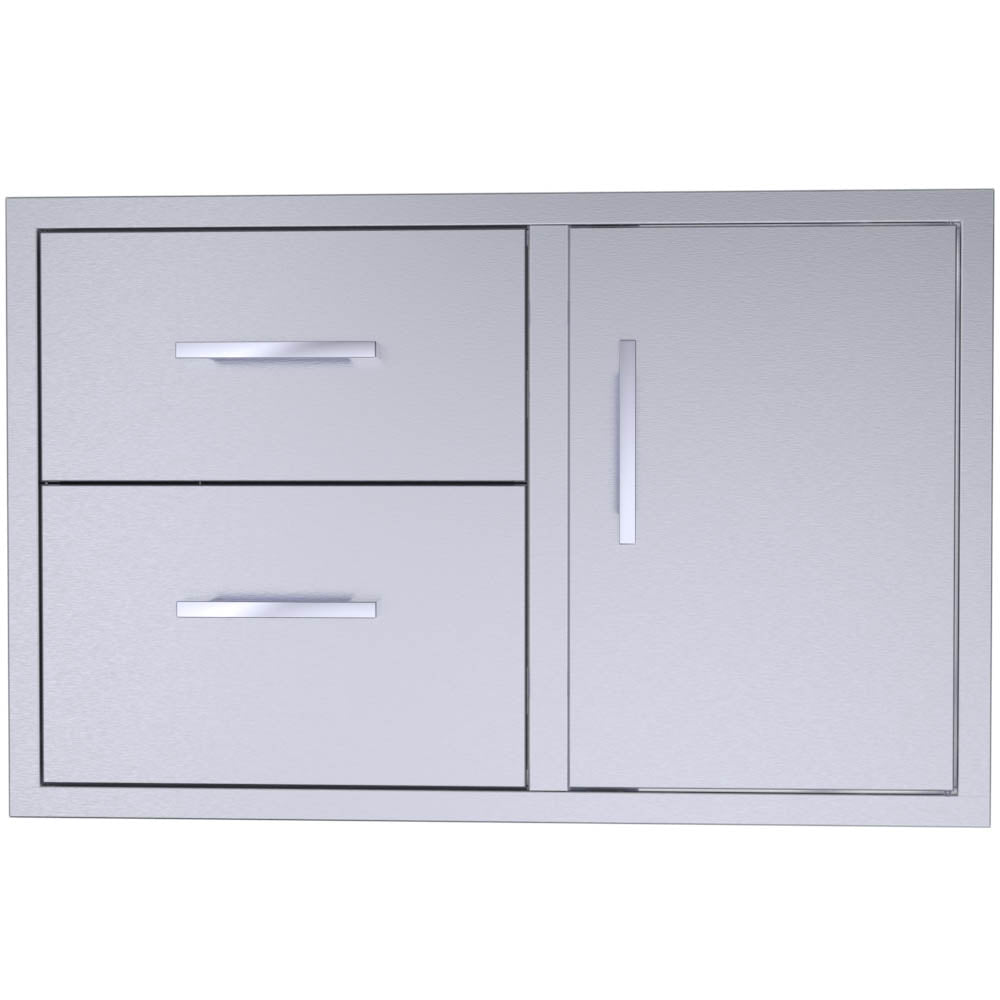 Sunstone Signature Series Beveled Style 36 Inch Double Drawer Door Combo compliments most BBQ grill sizes between 34 Inches to 38 Inches and because of its unique variability, it works well with your cleanup or serving zones. Two Extra-Wide drawers to the left provide easy access for all your larger BBQ sauces, towels, and BBQ tools plus the versatile right side single door which works perfectly for either a large propane tank storage or plastic trash bin as shown. The open door design is great for easy access for any gas lines running to the grill and giving clear access for extra storage or removing the inside horizontal and vertical framing for full access to the interior of your island’s construction. Constructed with all 304 stainless steel frame, paneling, and drawer boxes, with complimentary 201 stainless steel enclosed drawer box which is protected from the weather. The combo drawer and door unit are designed to blend perfectly with most other industry Brands, BBQ grills and components with its even toned #4 horizontal light brushed finishes and all large polished squared handles.